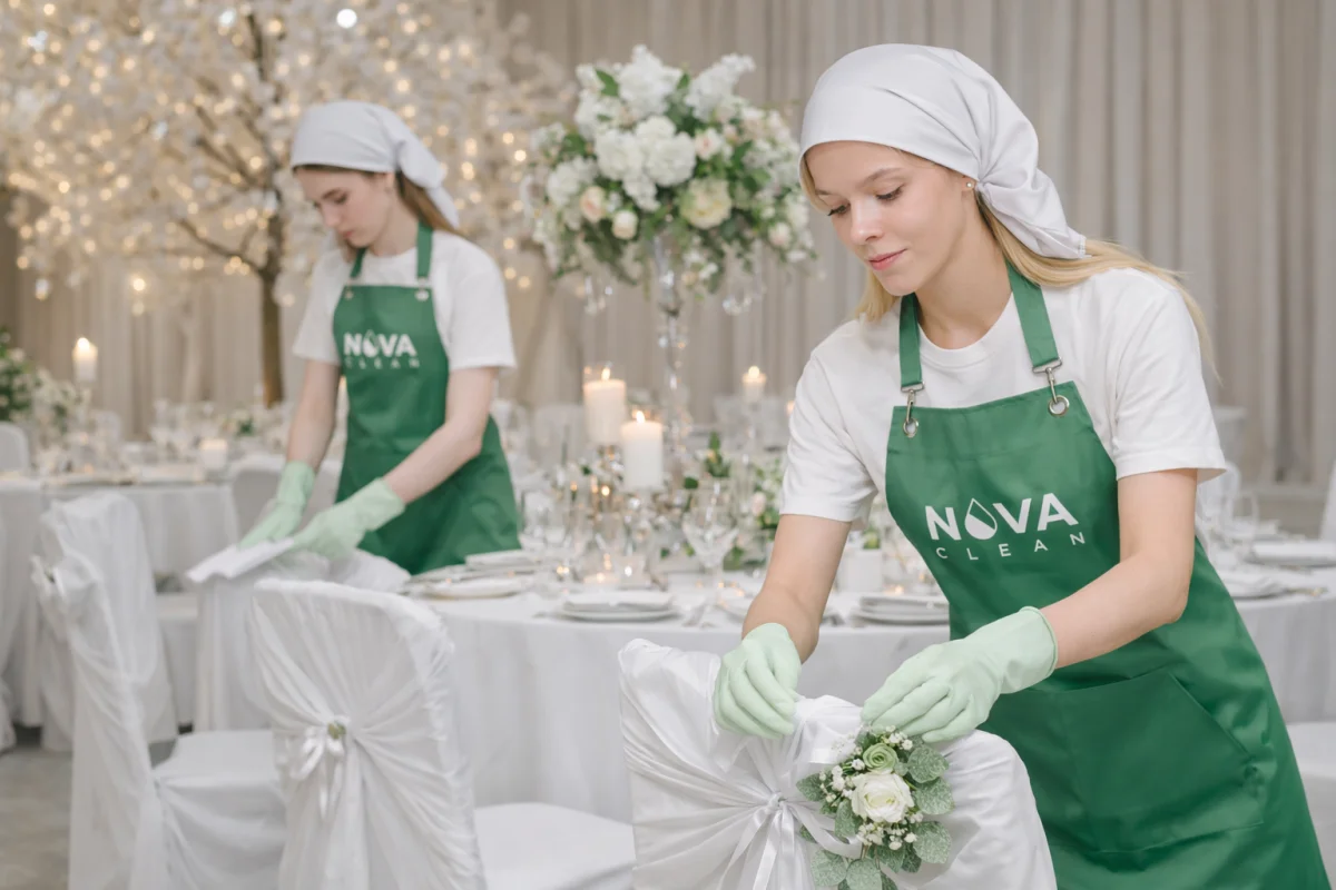 Перед свадьбой навели идеальную чистоту в зале, а после торжества аккуратно собрали декор и устранили пятна.